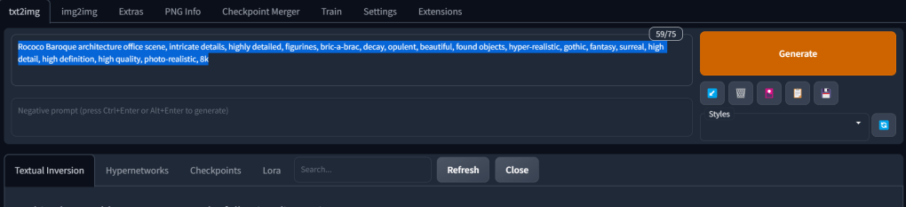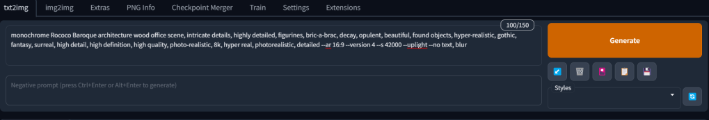 | monochrome Rococo Baroque architecture wood office scene, intricate details, highly detailed, figurines, bric-a-brac, decay, opulent, beautiful, found objects, hyper-realistic, gothic, fantasy, surreal, high detail, high definition, high quality, photo-realistic, 8k, hyper real, photorealistic, detailed –ar 16:9 –version 4 –s 42000 –uplight –no text, blur | ![]() stable-diffusion-classic Version 2 This result is not enough for my expectations. I expected a room scene but only got a wall concept. It does not look photo real as I requested so I would try shortening my ai text prompt to focus more on a few main concepts. | ![]() |