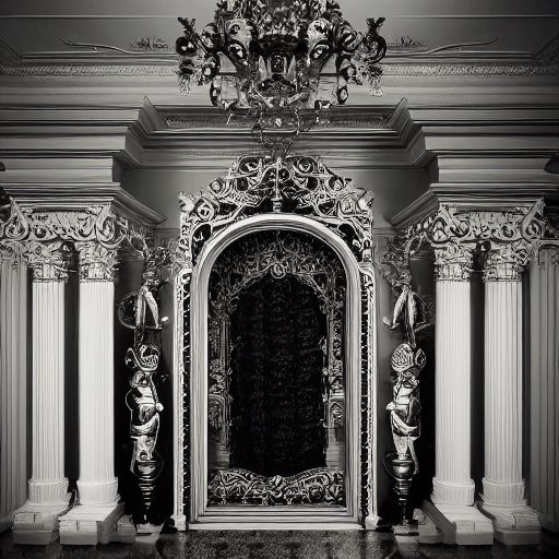 | monochrome Rococo Baroque architecture wood office scene, intricate details, highly detailed, figurines, bric-a-brac, decay, opulent, beautiful, found objects, hyper-realistic, gothic, fantasy, surreal, high detail, high definition, high quality, photo-realistic, 8k, hyper real, photorealistic, detailed –ar 16:9 –version 4 –s 42000 –uplight –no text, blur | stable-diffusion-classic Version 1.5 Another lovely AI Generation that I’m eager to use as a reference for a 3D Modeling project. I can see this will help me hone my 3D modeling skills with all those details. | ![]() |