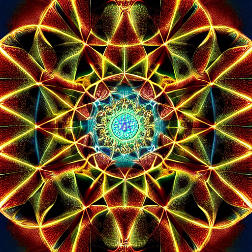 | Portrait of Sacred Geometry Fractal design, hyper-realistic, high detail, intricate, high definition, high quality, photo-realistic, 8k, hyper real, photorealistic, detailed –ar 16:9 –version 4 –s 42000 –uplight –no text, blur | Sampling Method: DPM++2M Karras Sampling Steps: 150 I like this result. I wonder why the colors change with the Sampling Methods, I’ll have to look into how the Sampling Methods work in future experiments. | ![]() |