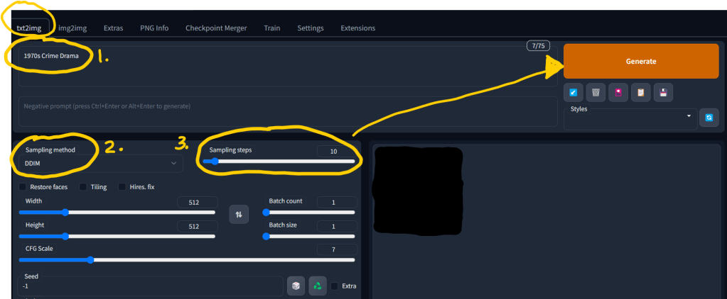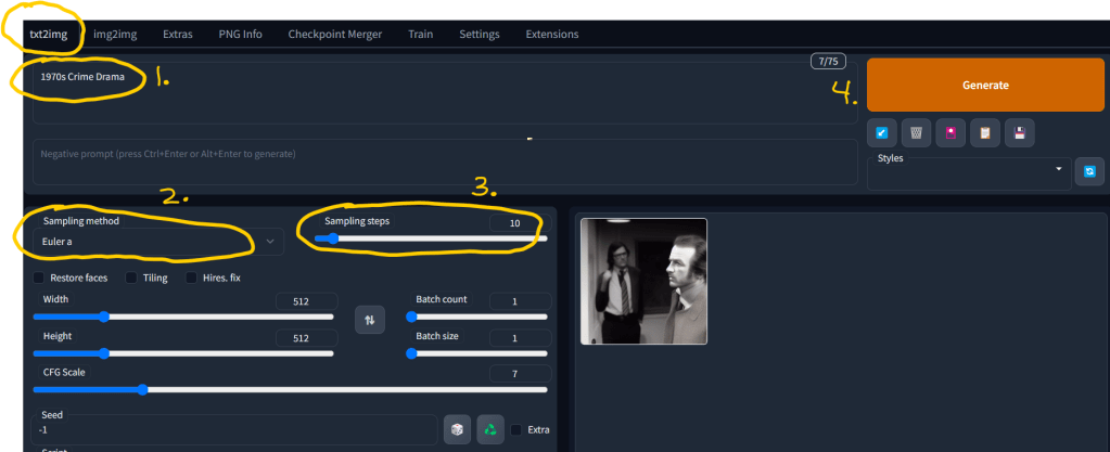 I used the DDIM Sampling Method because it runs very fast and allows me to quickly verify whether my AI Text Prompt idea will work as I hope. Speed allows me to iterate on each of my ideas very quickly until I design an AI Text Prompt that works as I need it to. I tested a variety of brainstorming ideas from complex to simple and finally ended up happy with a very simple text prompt: “1970s Crime Drama ” using the DDIM Sampling Method at 10 Steps, again for 50 Steps, 100 Steps and 150 Steps with nice results that were not too dramatically different from previous step number choices. This is a great option for fast iterative brain storming.