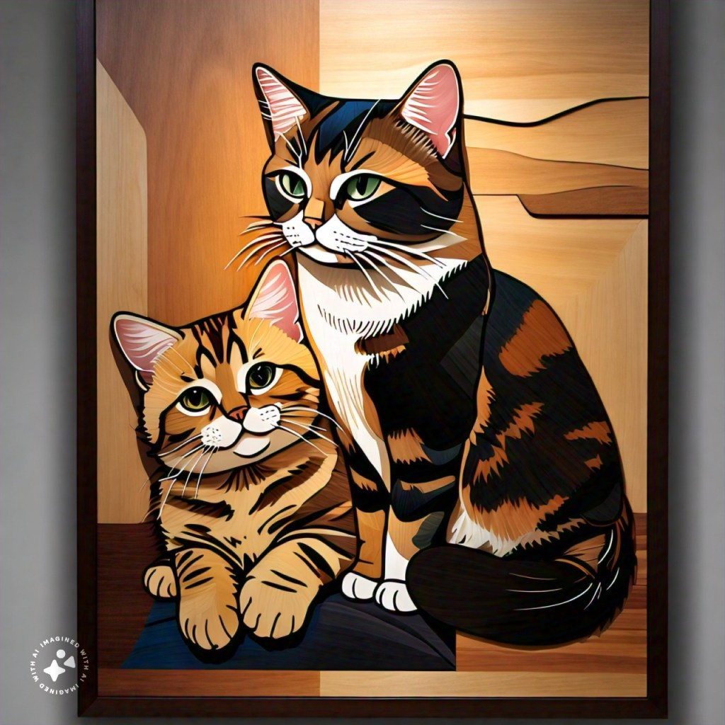![]() | intarsia art of two cats, high contrast, shadows, leftlight, photo realistic |