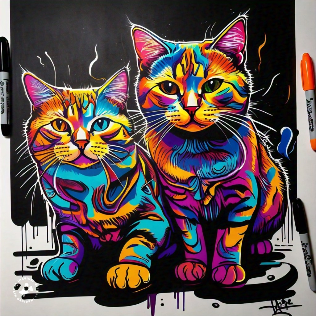 ![]() | sharpie graffiti art of two cats, high contrast, shadows, downlight |