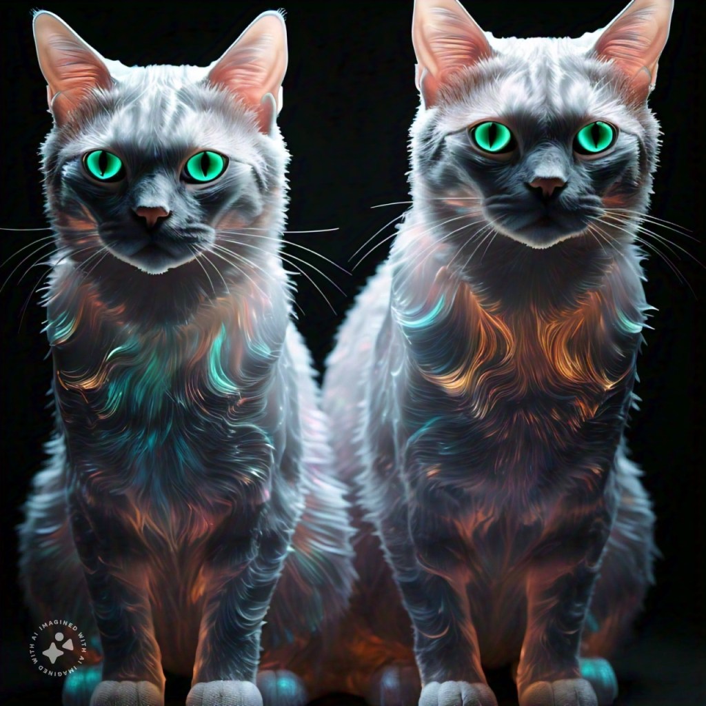 ![]() | sketch two transparent cats on a black background, uplight |